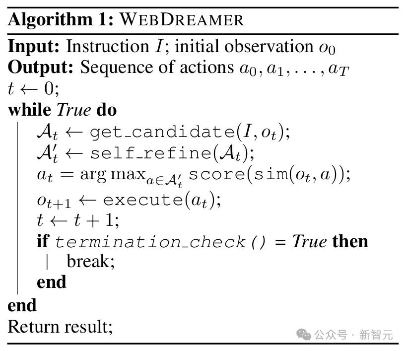 在算法1中,他们展示了WebDreamer整体设计的伪代码。termination check用于验证模型是否输出停止动作,其规则为当算法达到最大步骤或连续3次重复一个动作时,则停止继续执行算法。