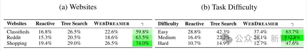 虽然在总体成功率方面,还是基于树搜索的方案更高,但它实际上并不适用于真实的网络场景。而WebDreamer则可以提供一种更灵活且适应性更强的替代方案。